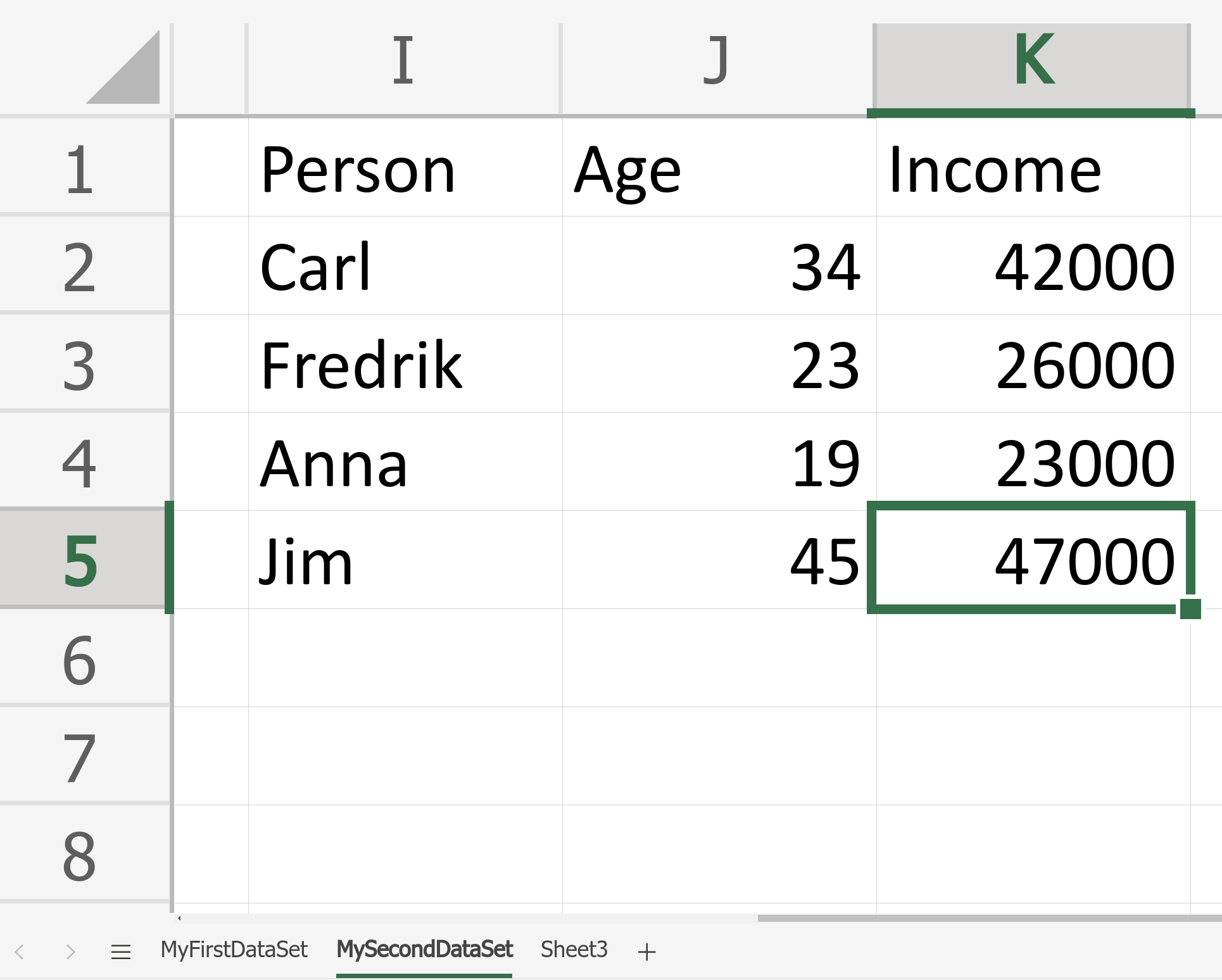 Excel files may contain more than one dataset, organized as Excel sheets. Here is an example (note the multiple sheets at the bottom):